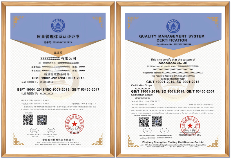 工程建設施工企業(yè)質(zhì)量管理體系認證證書(shū)樣本:
