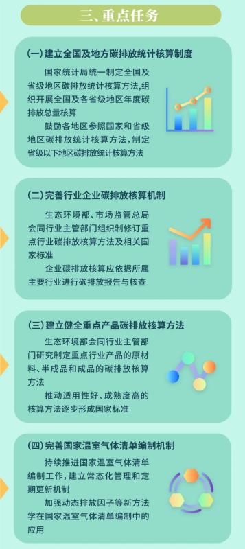 《方案》明確建立全國及地方碳排放統計核算制度、完善行業(yè)企業(yè)碳排放核算機制、建立健全重點(diǎn)產(chǎn)品碳排放核算方法、完善國家溫室氣體清單編制機制等四項重點(diǎn)任務(wù),提出夯實(shí)統計基礎、建立排放因子庫、應用先進(jìn)技術(shù)、開(kāi)展方法學(xué)研究、完善支持政策等五項保障措施,并對組織協(xié)調、數據管理及成果應用提出工作要求。